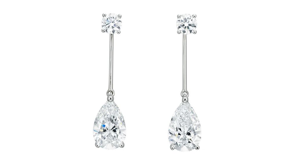 Пара сережек с бриллиантами грушевидной огранки, цвета D, чистоты VVS1, весом 3,28 и 3,25 карата имеет предварительную максимальную оценку в 800 000 гонконгских долларов ($ 102 787).