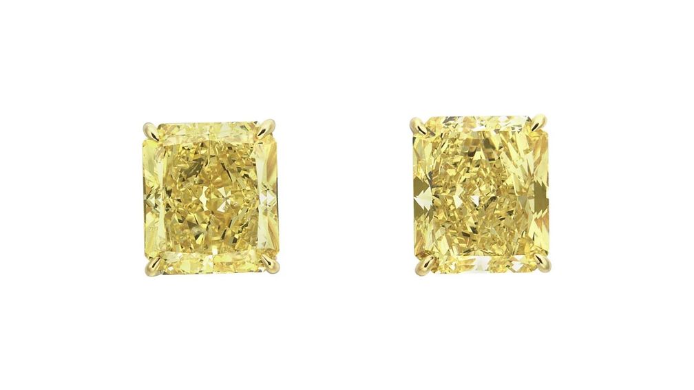 Эти серьги с прямоугольными бриллиантами, вероятно, принесут до 800 000 гонконгских долларов ($ 102 787). Один из них фантазийного ярко-желтого цвета и весит 5,23 карата, а другой – фантазийного интенсивно-желтого цвета и весит 5,12 карата.