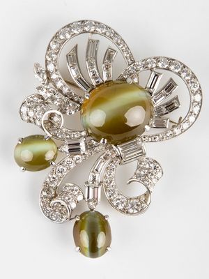 Винтажные украшения ручной работы носят с вечерними нарядами. Массивные броши с хризобериллом прикрепляют к карманам, лацканам демисезонного пальто, куртки или украшают ими клатч, стильную сумку.