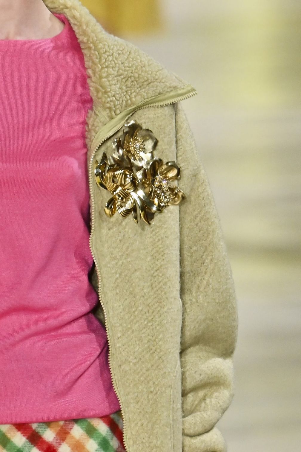 От флисовых курток до искусственного меха, все образы Miu Miu подчеркнуты крупными золотыми украшениями с одинаковым достоинством. Это аксессуары, которые поднимают образ на новый уровень и идеально соответствуют изысканной, но слегка бунтарской эстетике бренда.