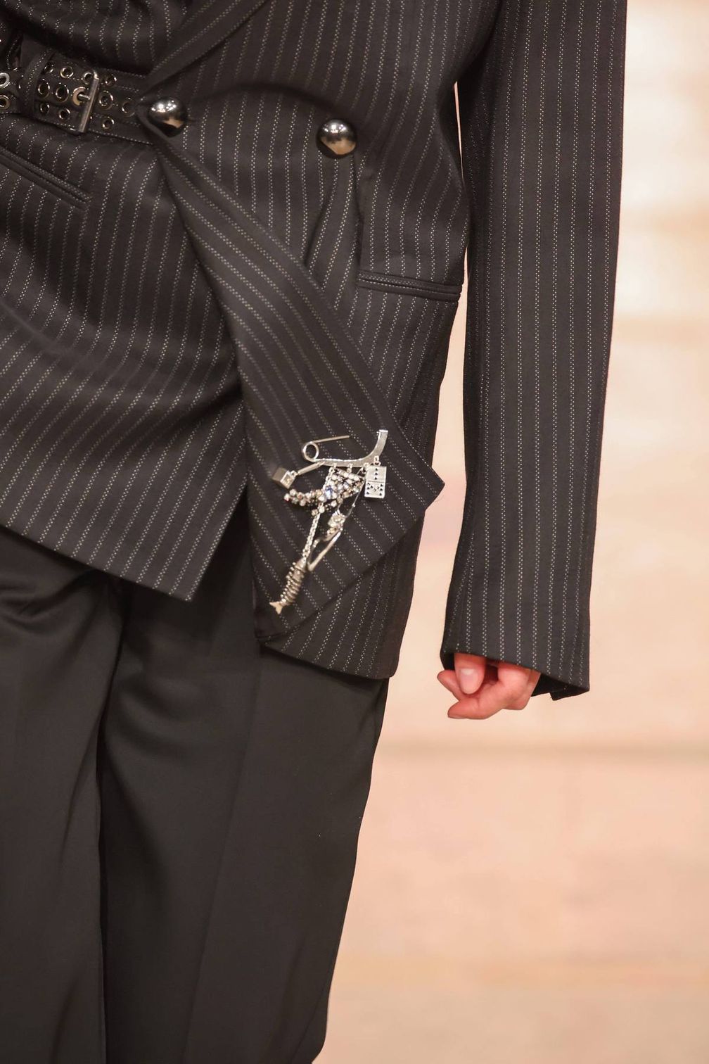 Isabel Marant украшает свои классические костюмы булавками с подвесками. Они добавляют панк-стиль к образам в духе 80-х, располагаясь на кармане или приподнимая уголок пиджака, придавая ему небрежный, но продуманный вид.