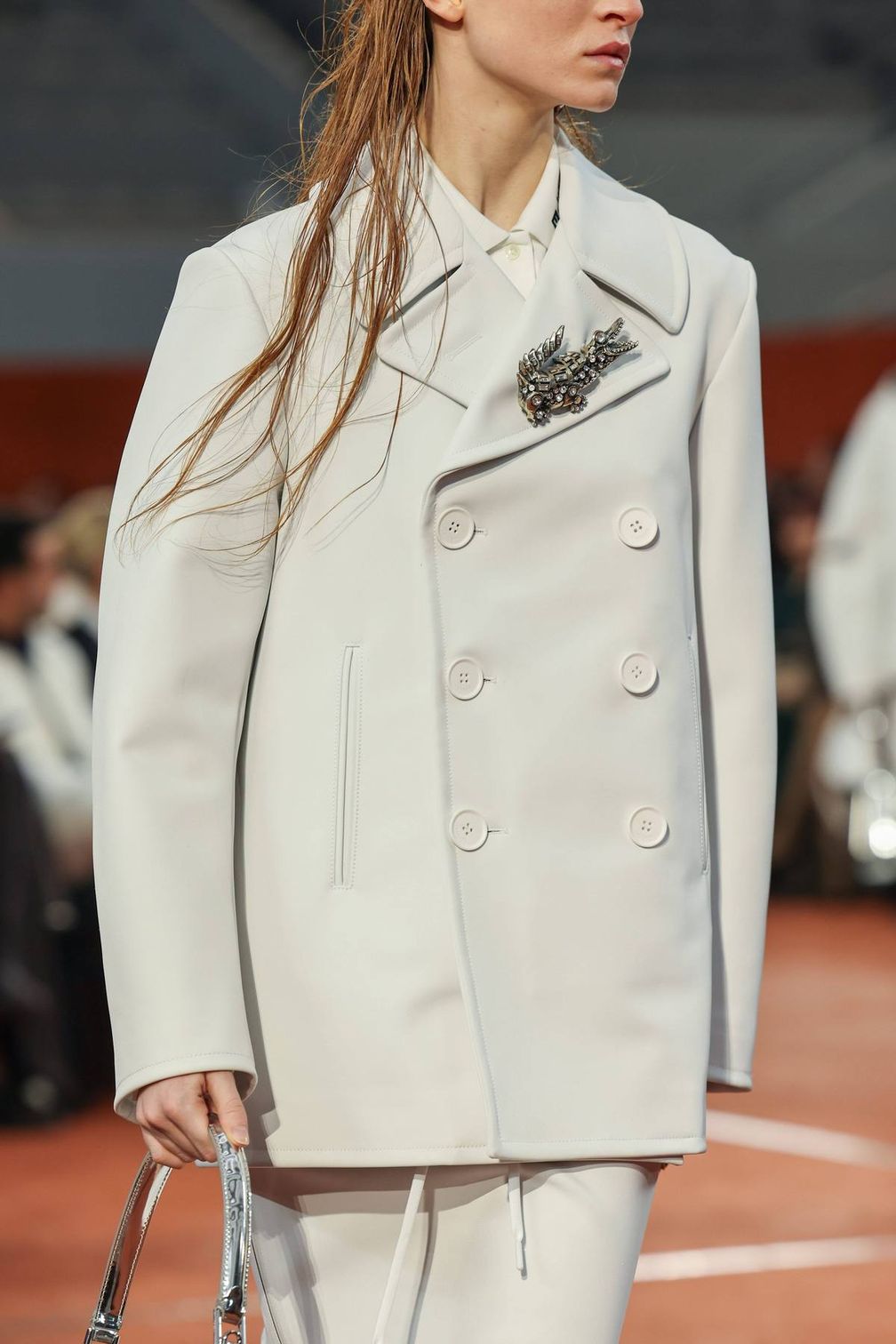 Что если классический логотип станет брошью? Это была идея Lacoste, и вместо того, чтобы пришивать знаменитого крокодила, они создали его трехмерную версию и прикрепили ее к лацканам двубортного жакета из коллекции.