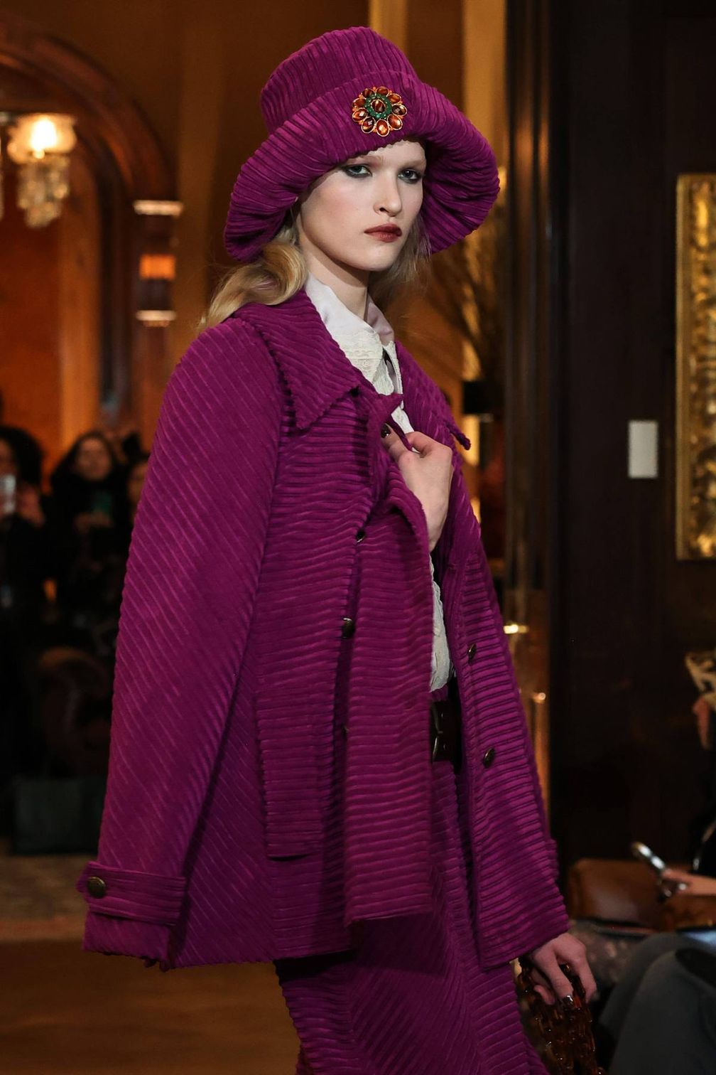 Anna Sui украшает шляпу брошью. Этот образ объединяет два тренда, которые будут доминировать в 2026 году. Яркие цвета и блеск — ключевые слова для комбинации, которая обязательно привлечет внимание.