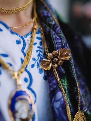 - Самое важное правило – драгоценность должна быть главным аксессуаром в аутфите. Остальные украшения могут быть лишь дополнениями, поэтому следует отдавать предпочтение миниатюрным моделям со сдержанным дизайном. К примеру, удачными компаньонами для броши станут аккуратные серьги-гвоздики с самоцветами, кольцо в виде обруча или тонкий браслет-цепочка.