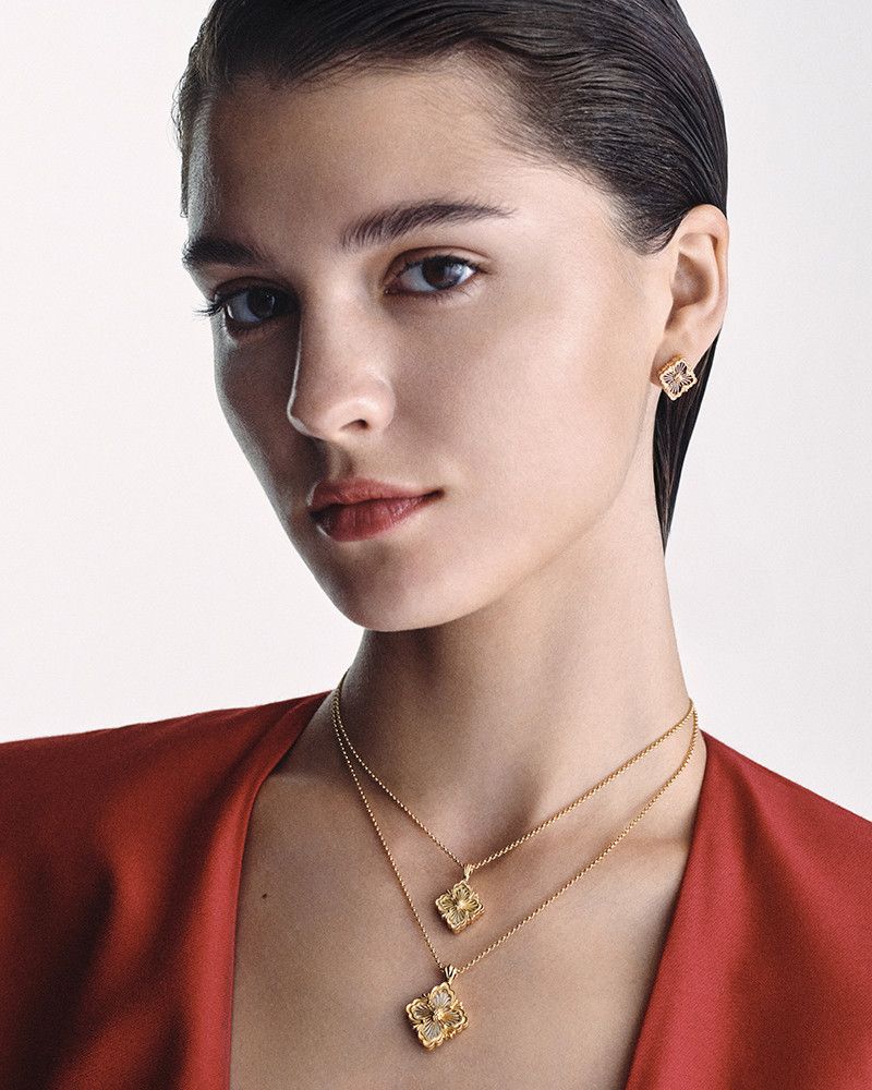 Запонки Macri с гравировкой в неповторимой технике rigato дополнены яркими штрихами яшмы. Серьги-кольца Ramage воздают дань уважения природе благодаря изящным композициям из листьев и бриллиантов, а коллекция Étoilée с необычайной деликатностью улавливает свет, воплощая в каждом творении всю элегантность и мастерство, делающие коллекцию уникальной. Наконец, серебряные украшения из коллекции Blossoms с цветочными мотивами привносят нотку современности в праздничные дни.