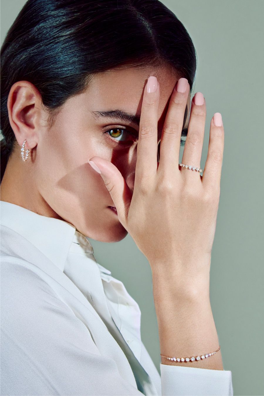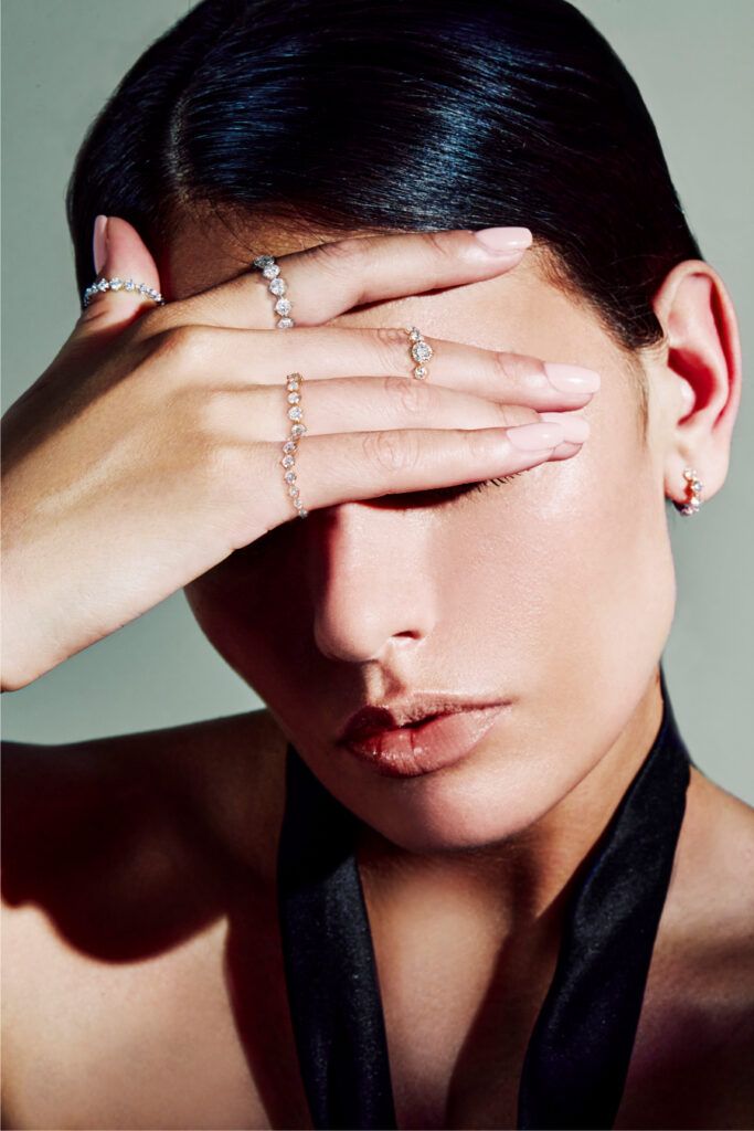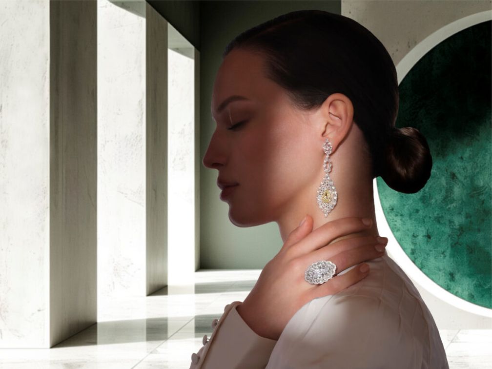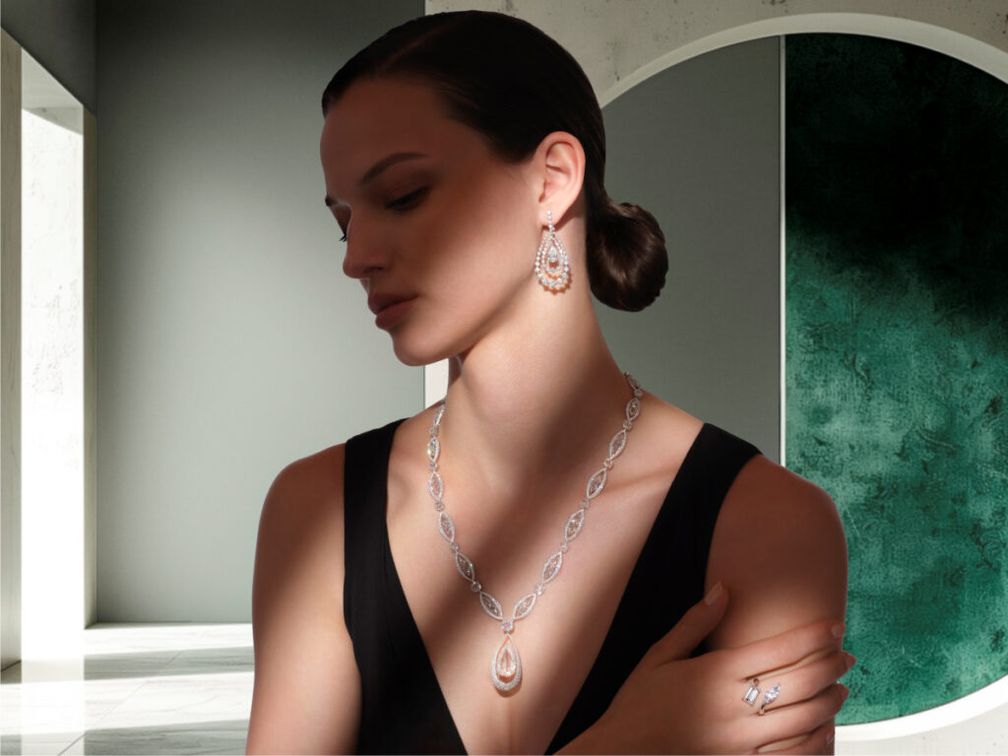 Характерна архитектурная конструкция изделий. Легкий титан сочетается с белым и розовым золотом, чистые линии встречаются с изысканными объемами. Различные огранки – от грушевидной и огранки маркиза до шестиугольной, ромбовидной и восьмиугольной – вступают в динамичный диалог, превращая каждое ювелирное изделие в современную скульптуру.