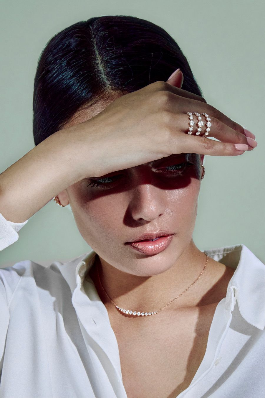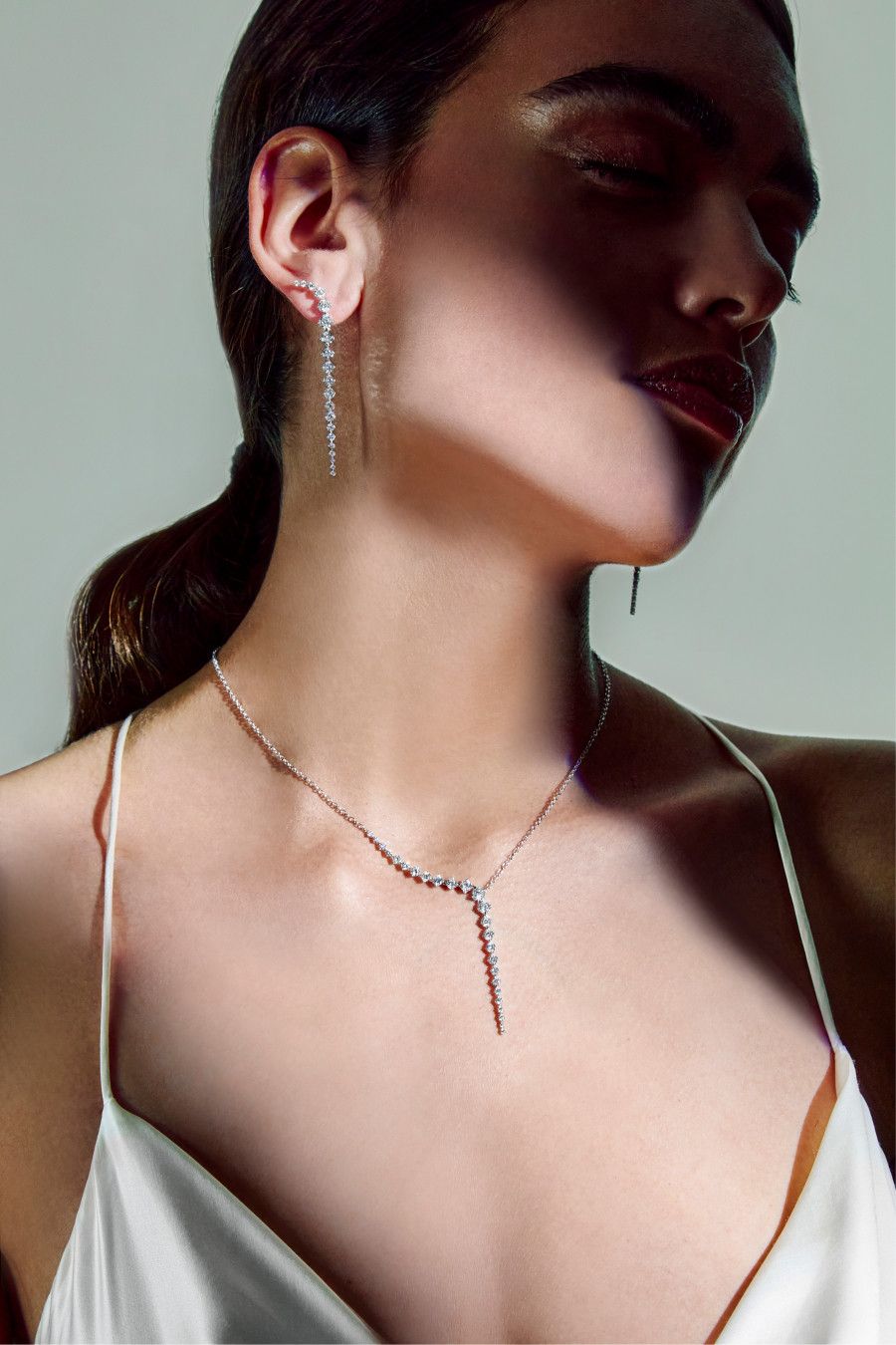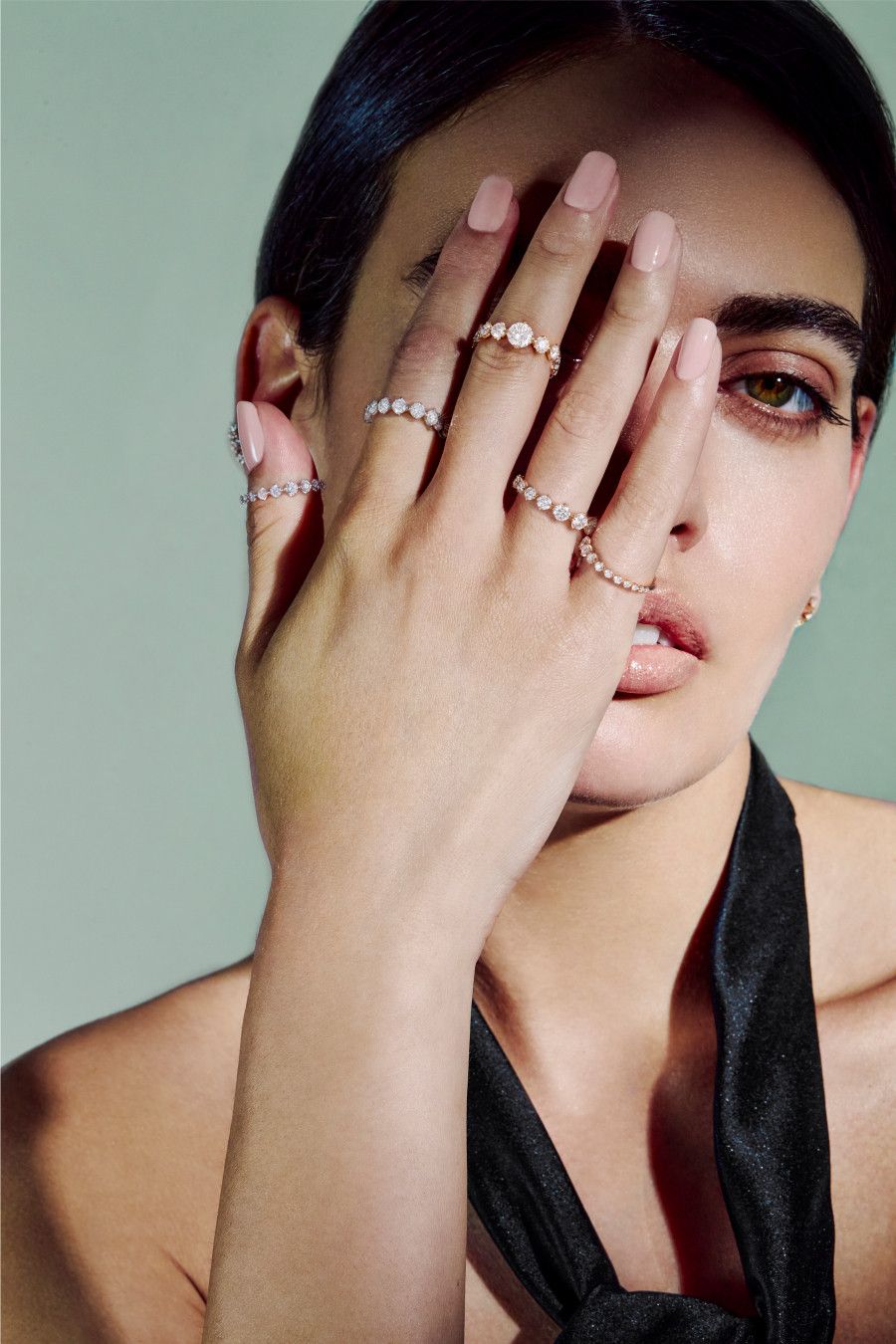Характерна архитектурная конструкция изделий. Легкий титан сочетается с белым и розовым золотом, чистые линии встречаются с изысканными объемами. Различные огранки – от грушевидной и огранки маркиза до шестиугольной, ромбовидной и восьмиугольной – вступают в динамичный диалог, превращая каждое ювелирное изделие в современную скульптуру.