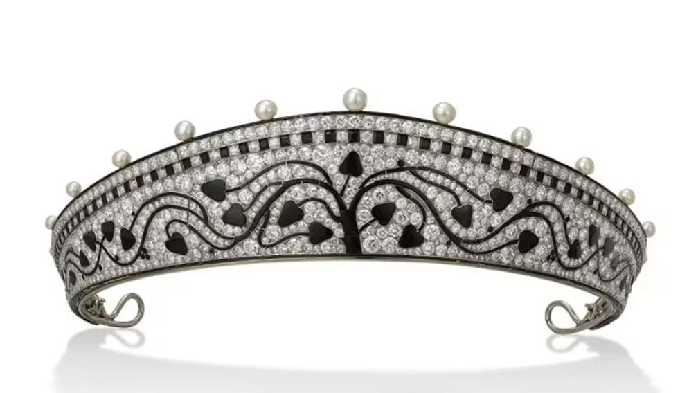 Тиара Cartier Paris, 1914 год. Платина, бриллианты, природный жемчуг, оникс и эмаль. Эта яркая тиара – новаторский образец стиля ар-деко (любезно предоставлено Cartier):