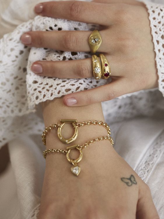 Кольца и браслеты с шармами из 18-каратного золота на модели (Cece Jewellery):