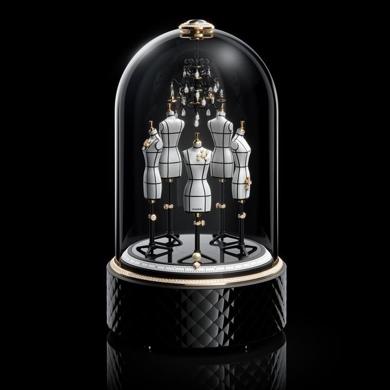 Уникальные часы Couture Workshop, на которых изображены пять украшенных драгоценностями манекенов, танцующих под люстрой, одновременно служат музыкальной шкатулкой, исполняющей мелодию My Woman, любимую мадемуазель Шанель: