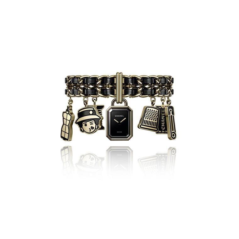 Аналогичным образом часы Première Charms Couture с циферблатом в виде висячего замка фиксируют на запястье золотую цепочку и плетеный кожаный браслет. Золотая булавка, наперсток, манекен, катушка и ярлык одежды украшают браслет, что само по себе напоминает о знаменитых цепочках для сумок этого Дома.