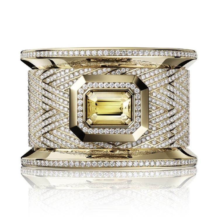 Миниатюрный циферблат скрыт под желтым сапфиром огранки изумруд (около 17,73 карата) в единственной в своем роде модели Bobbin Cuff Couture от Chanel: