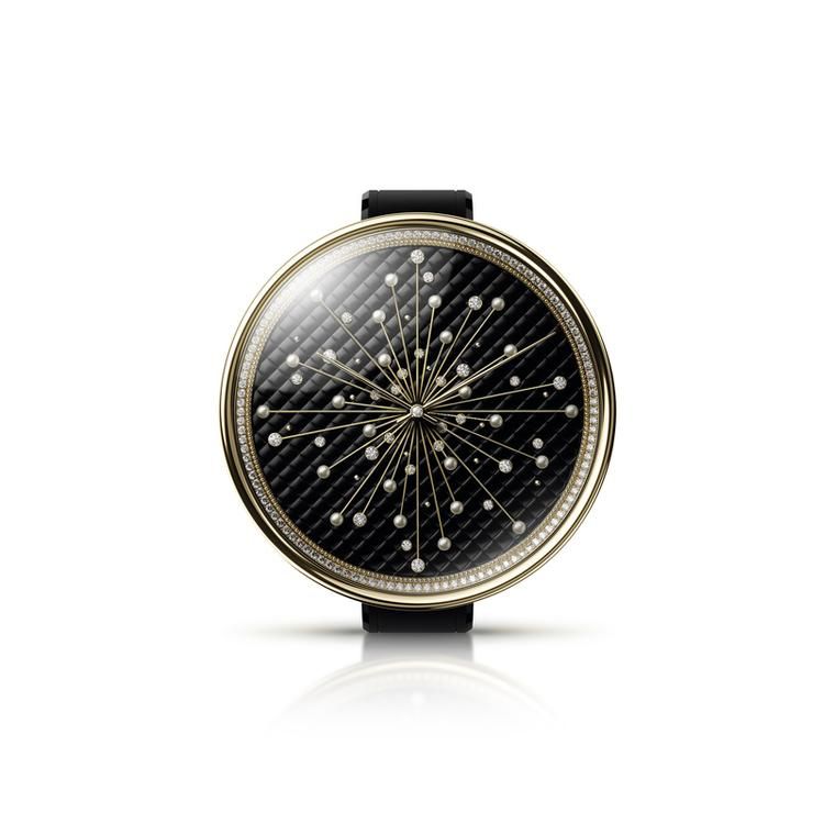 Часы Première Ruban Couture имеют черный ремешок в виде рулетки, который дважды оборачивается вокруг запястья. С заводной головки свисает черный лаковый шарм с изображением Габриэль.