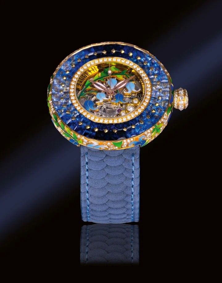 Цветочная тематика придает часам их неповторимый характер. Синие и зеленые тона, декоративные детали и открытость скелетонизированного циферблата создают богатое визуальное взаимодействие, в котором часовое и ювелирное искусство действительно сливаются воедино.