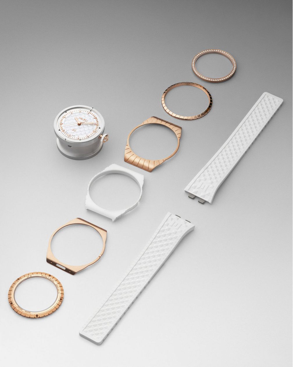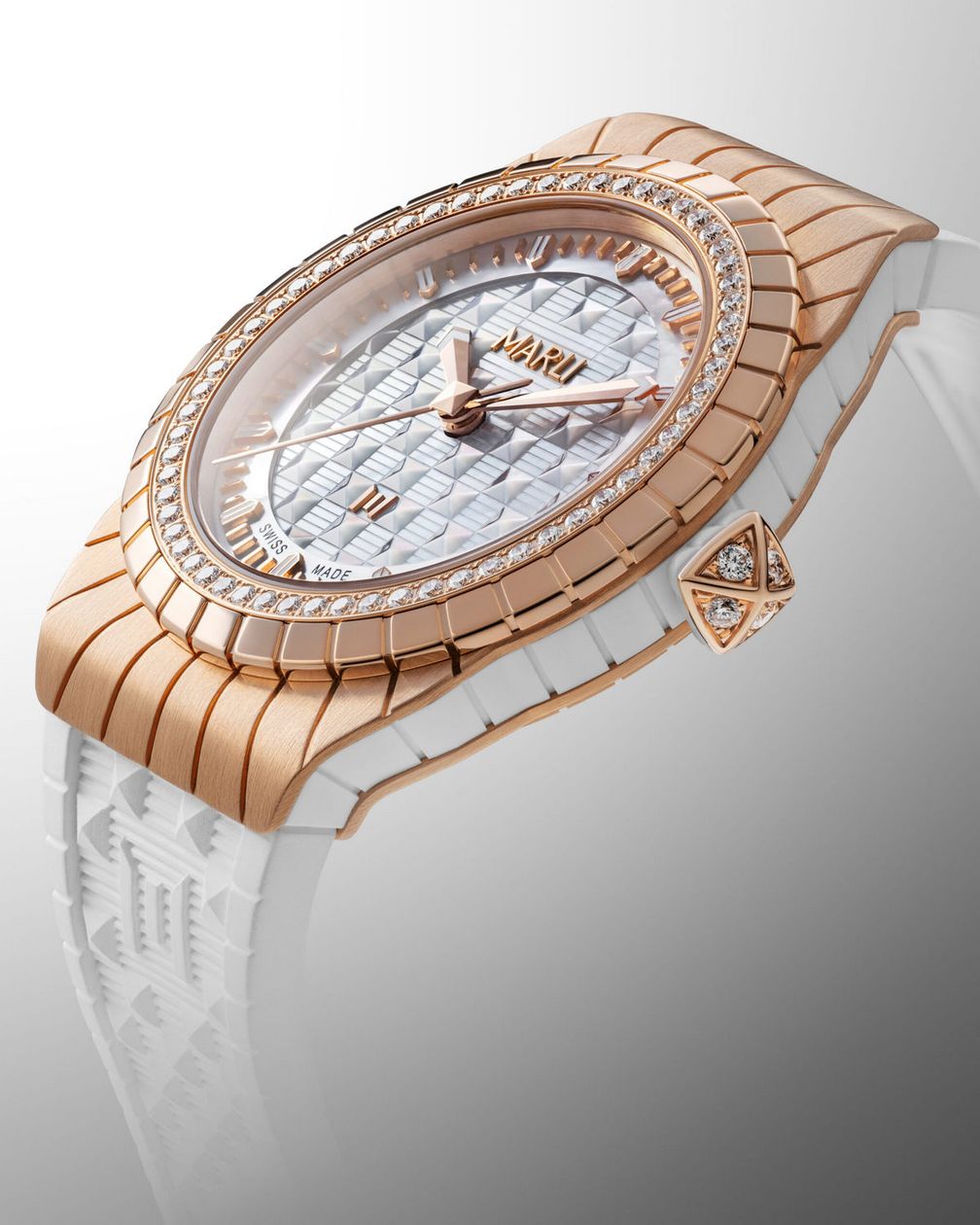 Центральный элемент всех моделей – трехмерный циферблат с пирамидальным узором из цельного перламутра. Он разрабатывался в течение трех лет и переводит культовый мотив MARLI в новое измерение. Точно выполненные пирамиды отражают свет под разными углами, придавая каждой модели динамичную поверхность, которая меняется с каждым движением.