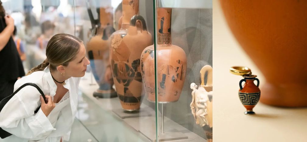 Ниархос рассматривает амфоры в Музее Акрополя, которые послужили источником вдохновения. Справа: шарм Amphora (Maria Mavropoulou for The New York Times):