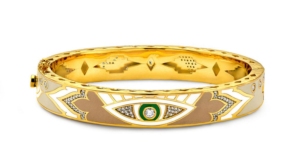 Браслет Eye от Buddha Mama из 20-каратного желтого золота с бежевой, серо-коричневой, белой и коричневой эмалью и бриллиантами: