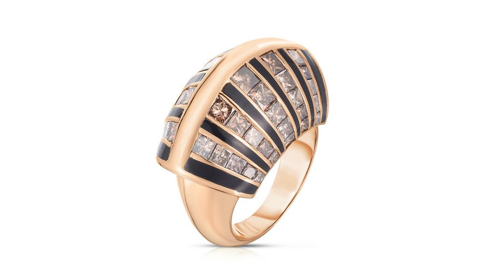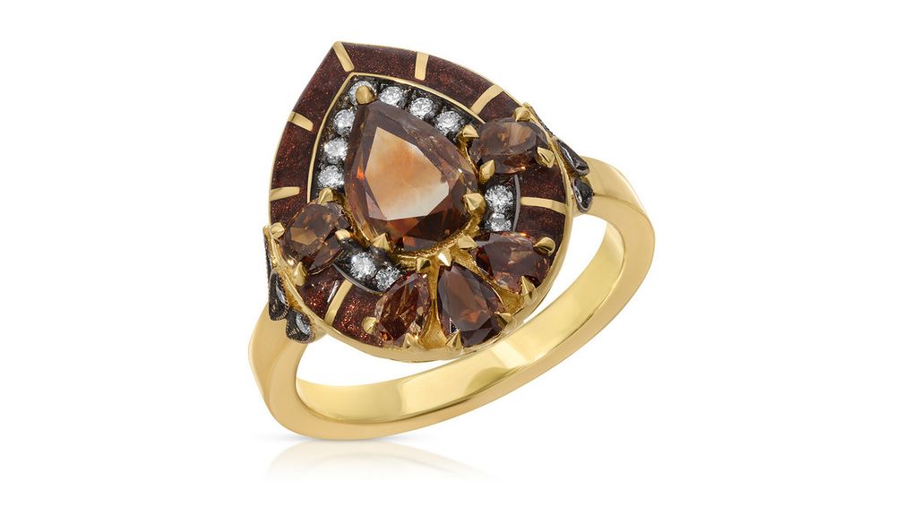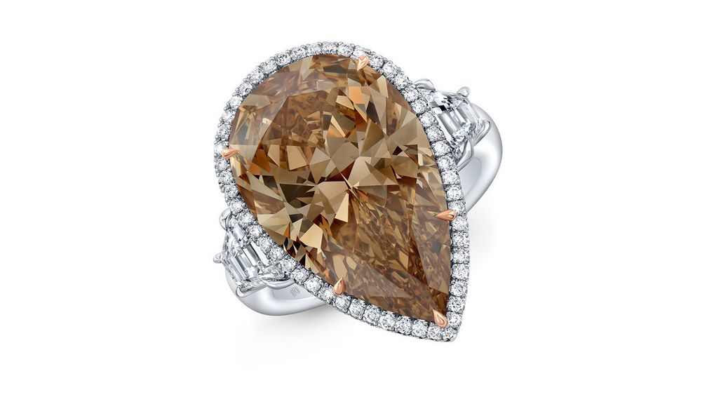 Кольцо от Rahaminov Diamonds из платины и 18-каратного розового золота с 12-каратным коричнево-желтым бриллиантом грушевидной огранки, окруженным трапециевидными бриллиантами и мелкими круглыми бриллиантами: