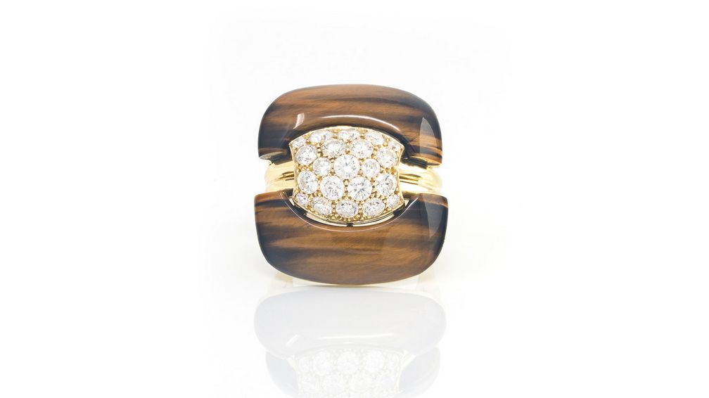 Кольцо Trophy от Jenna Blake из 18-каратного желтого золота с бриллиантами и тигровым глазом: