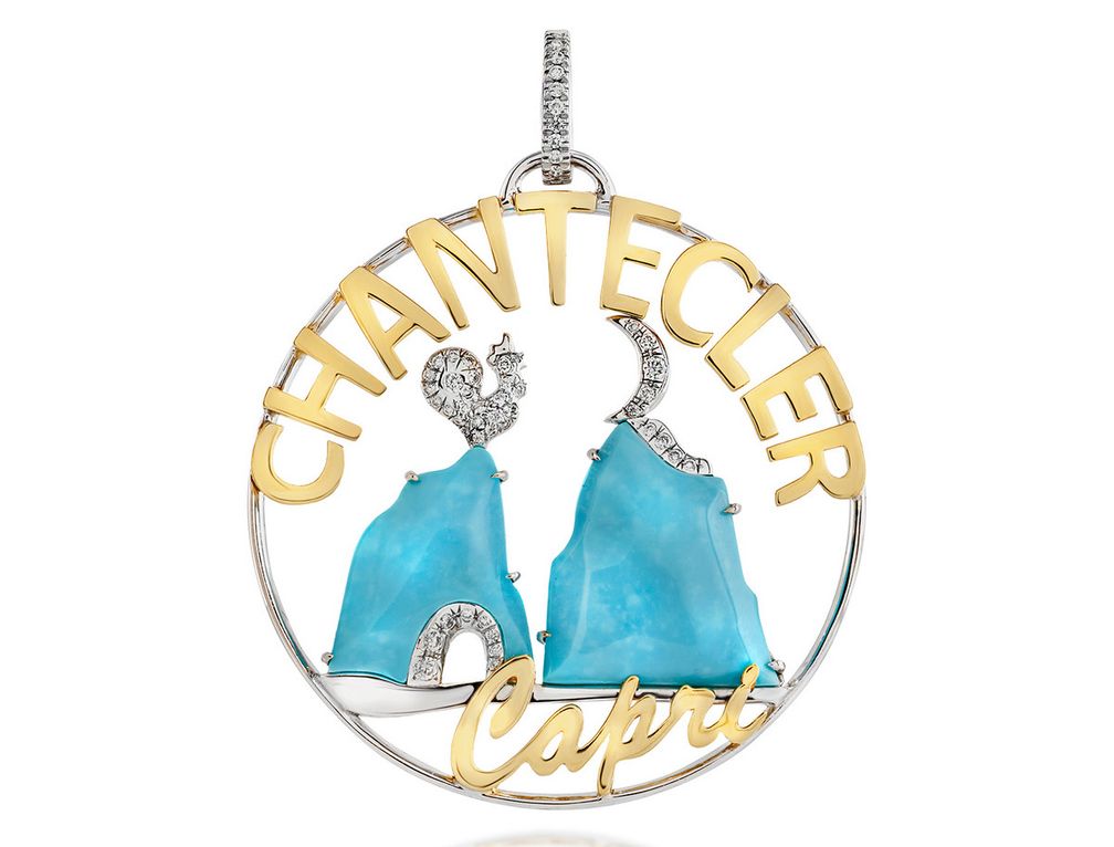 Подвеска с логотипом из бело-желтого золота 18 карат с 49 бриллиантами круглой огранки общим весом 0,27 карата и бирюзой.
