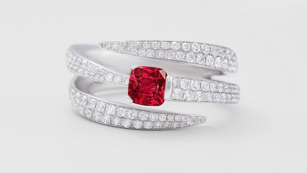 Кольцо в три ряда из белого золота с рубином огранки кушон и паве из бриллиантов круглой огранки.