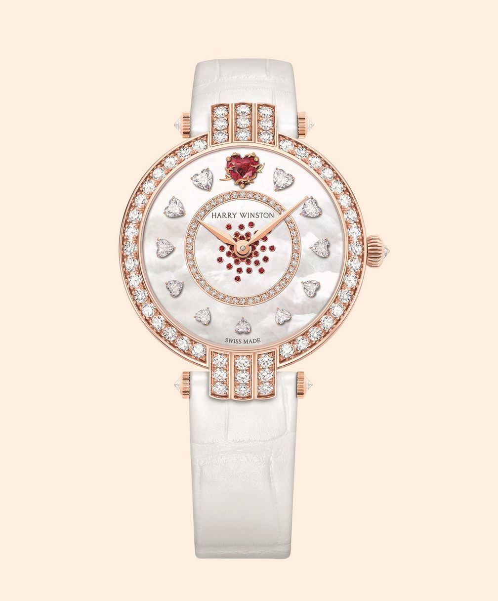 Часы Premier Valentine’s Day Automatic 36 мм. Ограниченная серия из 14 экземпляров из 18-каратного розового золота, бриллиантов, рубинов и перламутра. Белый ремешок из кожи аллигатора и пряжка из розового золота.