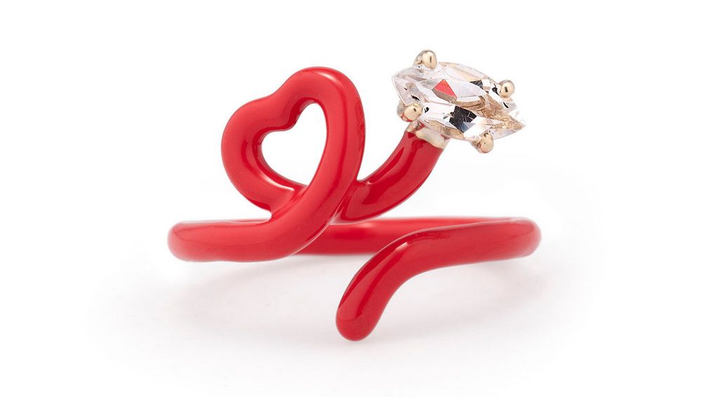 Кольцо Baby Vine Heart. Лимитированная серия из серебра с расписанной вручную красной эмалью и горным хрусталем огранки «маркиза» в оправе из 9-каратного желтого золота.
