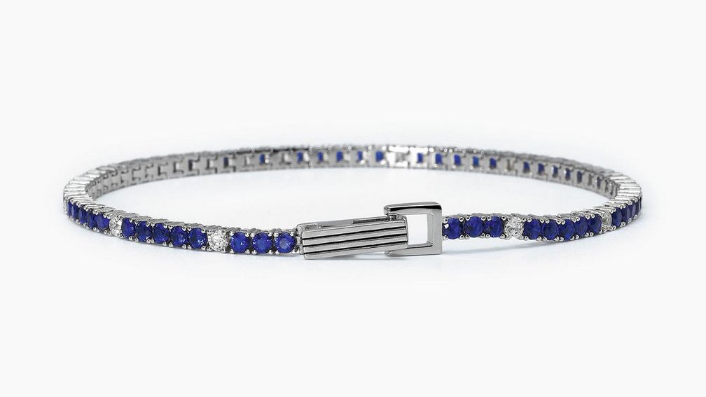 Мужской теннисный браслет из родированного серебра с белыми и синими цирконами и застежкой-клипсой.
