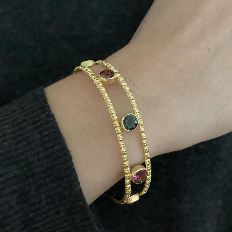 Этот браслет изготовлен вручную в ателье Lalaounis в Афинах и является данью безупречному мастерству Дома, который использует древние техники различных эпох и культур. Две золотых решетки окружают зеленые и красные турмалины, повторяющие красочные украшения на нубийских вазах 5-го века до н.э.