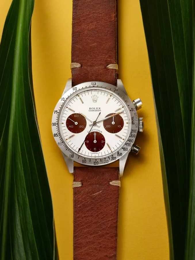 Еще одни невероятно редкие часы – Rolex Cosmograph Daytona ref. 6239 Tropical registers. Выпущенный в 1960-х годах, этот экземпляр был ранним примером ставшего культовым спортивного хронографа, с постоянным количеством вариаций, наблюдаемых в серии по мере ее развития в течение десятилетия. Этот конкретный экземпляр имеет циферблат серебристо-белого цвета и отличается простым дизайном циферблата и корпуса, соответствующим старшим винтажным аналогам из семейства Daytona.