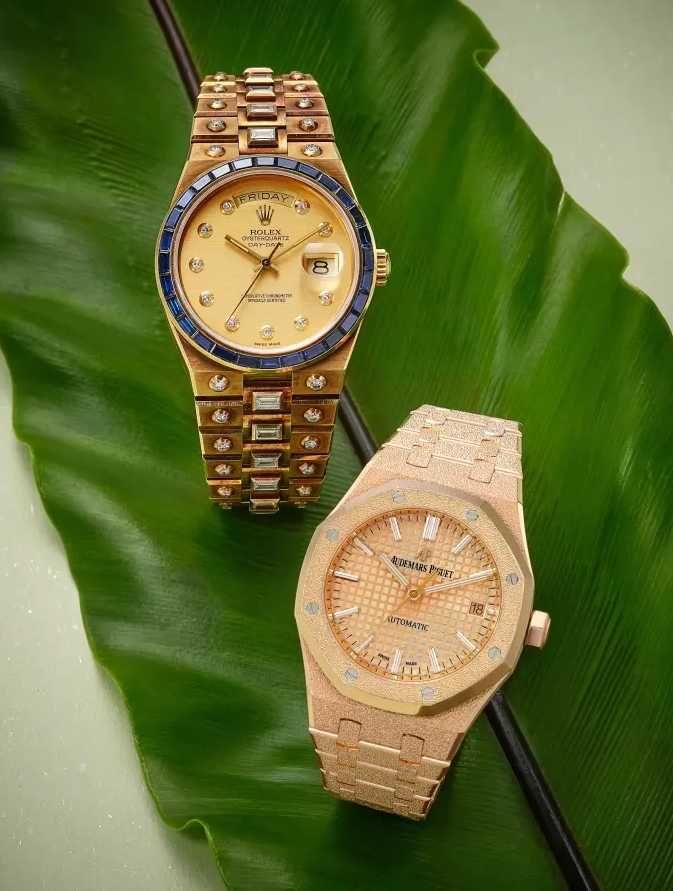 Rolex Oysterquartz Day-Date, ref. 19168 | Наручные часы из желтого золота, бриллиантов и сапфиров с указателем дня недели, даты и браслетом, около 1985 года; Audemars Piguet Royal Oak, ref. 15454OR.GG.1259OR.03 | Часы на браслете из матового розового золота с датой, около 2018 года (слева направо):