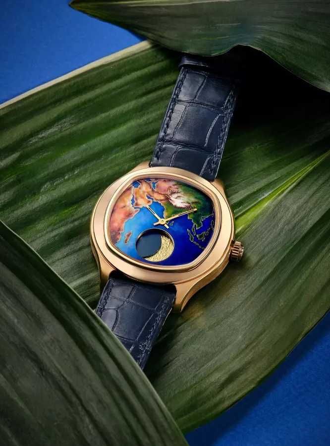 Замыкают экспозицию невероятно редкие часы от Piaget – Emperador Coussin XL Grande Lune «Planisphère». Модель с очаровательным циферблатом, выполненным в завораживающей технике перегородчатой эмали, подчеркивает уникальное выражение бренда в виде усложнения фазы луны. Перегородчатая эмаль (сloisonné, что в переводе с французского означает «отделение») требует использования металлической проволоки для создания различных областей, которые затем заполняются эмалевой пастой, обжигаются и полируются для завершения окончательного дизайна.
