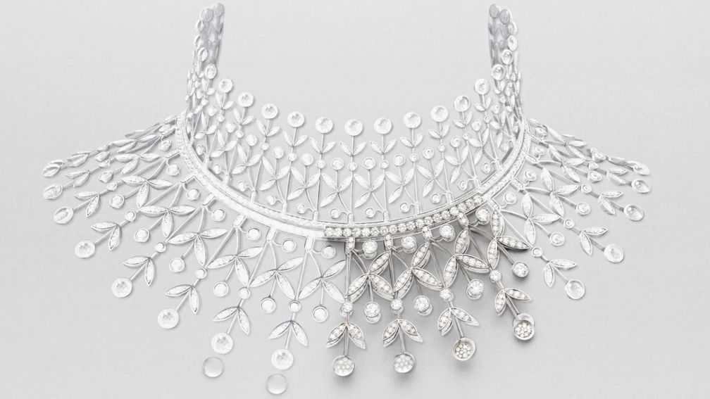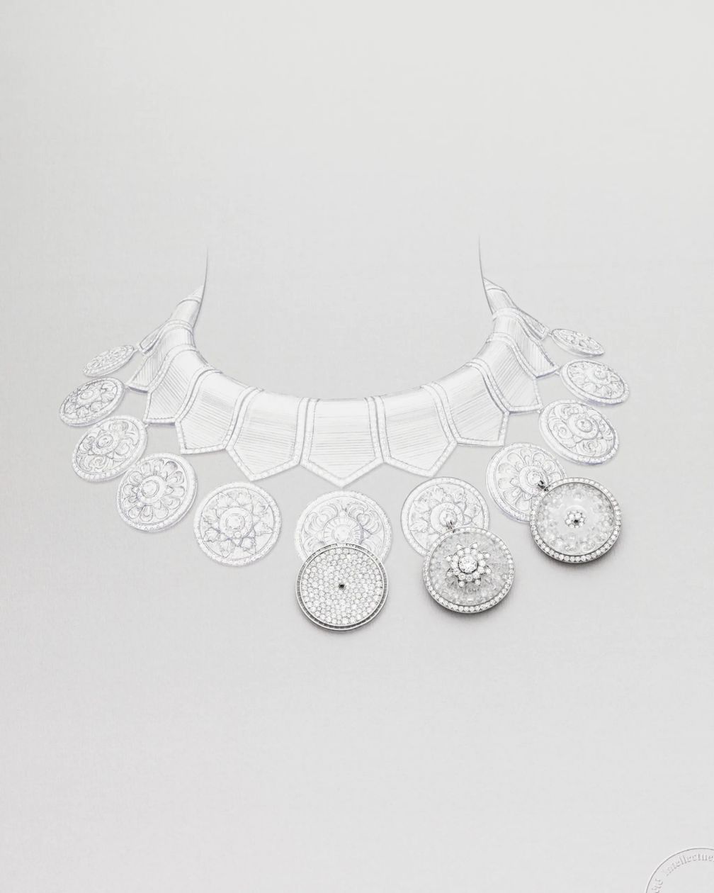 Церемониальный воротник с высоким воротом, который часто ассоциируется с королевскими церемониальными нарядами, был переосмыслен в кружевной бриллиантовый воротник, который можно разделить и носить тремя разными способами. Вдохновленное тиарой, которую Дом изготовил в 1900 году, колье состоит из 662 бриллиантов, расположенных в ажурном стиле, который является царственным и в то же время нежным.