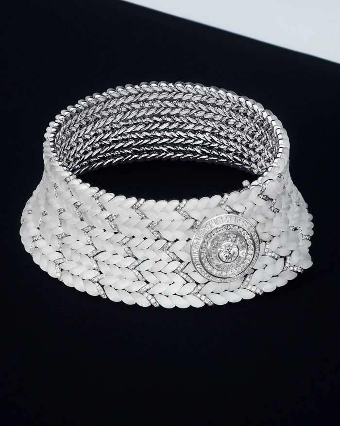 Примером такого достижения может служить воротник и манжета Tricot, выполненные с использованием горного хрусталя, нитиноловой проволоки (гибкого сплава никеля и титана) и природных бриллиантов, что создает впечатление вязаного воротника с шевронным рисунком. Это был технический триумф, потребовавший от мастеров более 1 000 часов работы, чтобы завершить оба изделия.