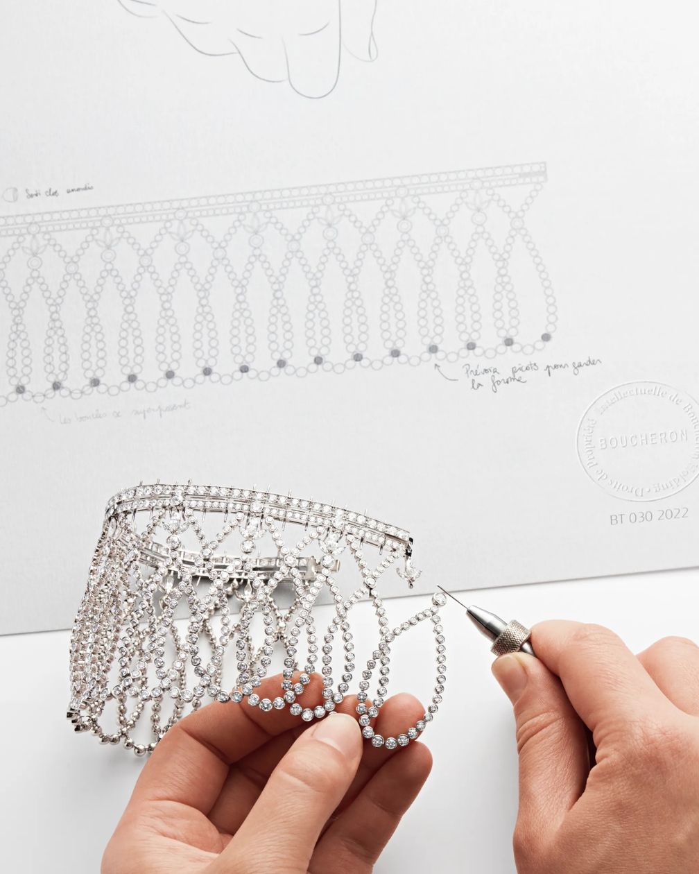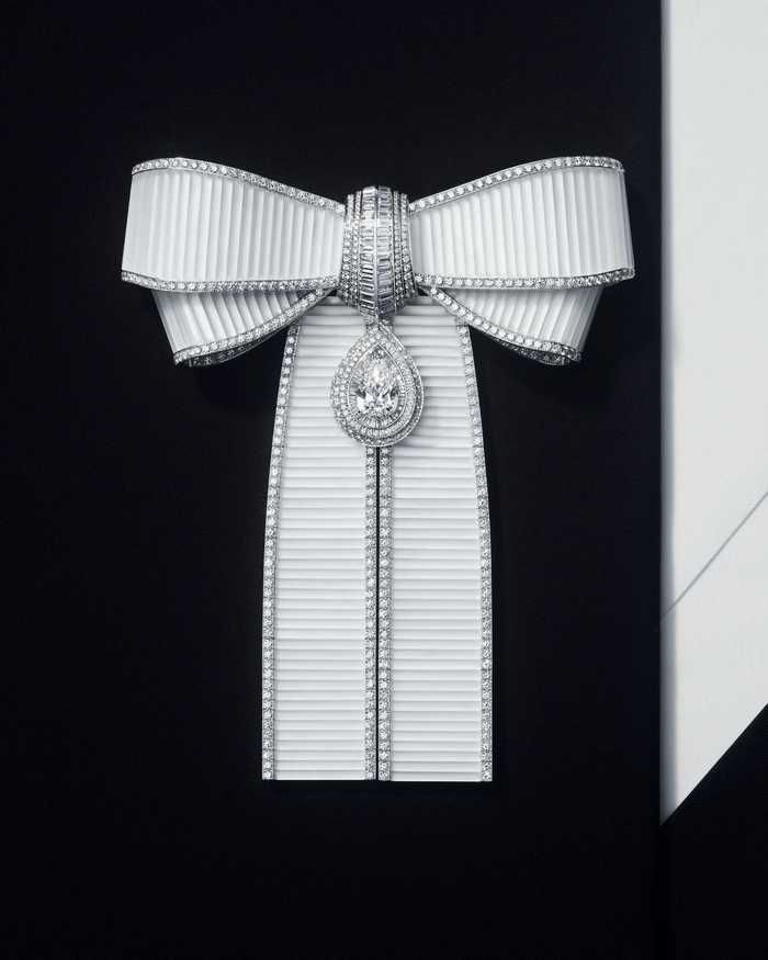 Как это часто бывает, отправной точкой для создания у Шуан стали богатые архивы Boucheron: отец основателя Фредерика Бушерона был мастером драпировки, что вдохновило ювелира на создание элегантных, плавных дизайнов в XIX веке. Она воссоздала кутюрные ленты, банты, пуговицы и эполеты в монохроматической палитре из горного хрусталя, бриллиантов и золота в стилях, отсылающих к богатой истории Дома.