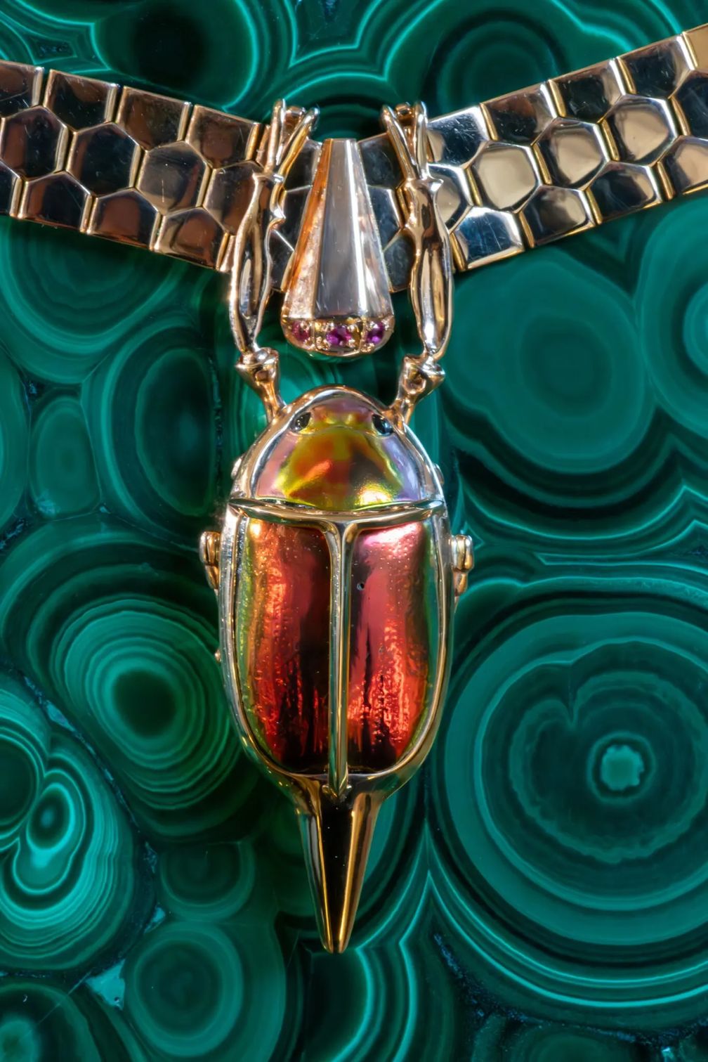 Она также дополнила красного жука Chrysina aurigans из Коста-Рики массивными золотыми ножками на шарнирах и повесила его на массивное ожерелье из 18-каратного золота 1960-х годов. А в ее серьгах-каплях сочетались зеленые жуки-златки из Индонезии, оранжевые спессартиты и нежная золотая бахрома.