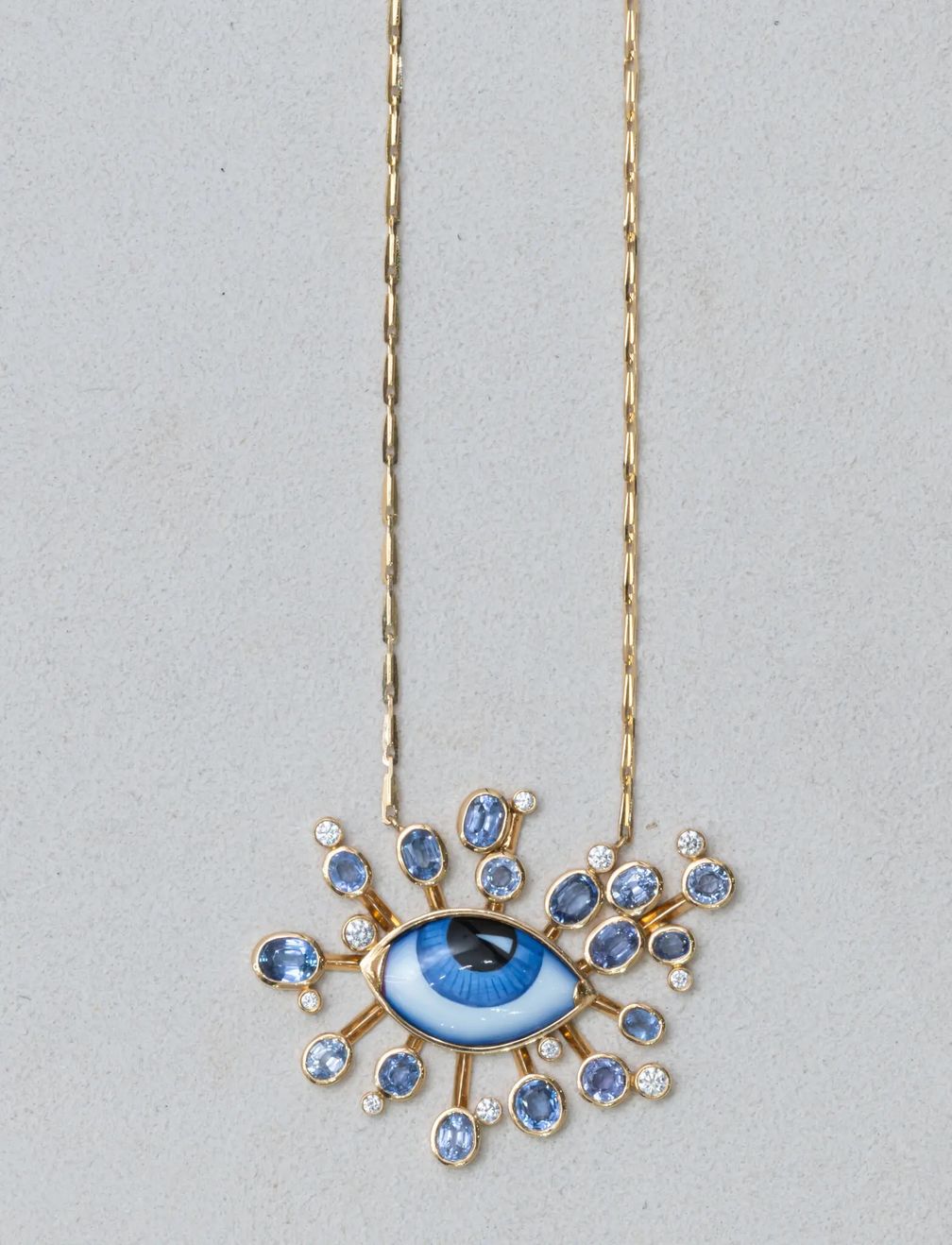 Каракостаноглу сказала, что эмалевые украшения от сглаза evil eye, которые она представила 15 лет назад, помогли укрепить репутацию Lito. В юбилейной коллекции бренда этот мотив был воплощен в таких изделиях, как колье L’Amour Céleste (Maria Mavropoulou for The New York Times):