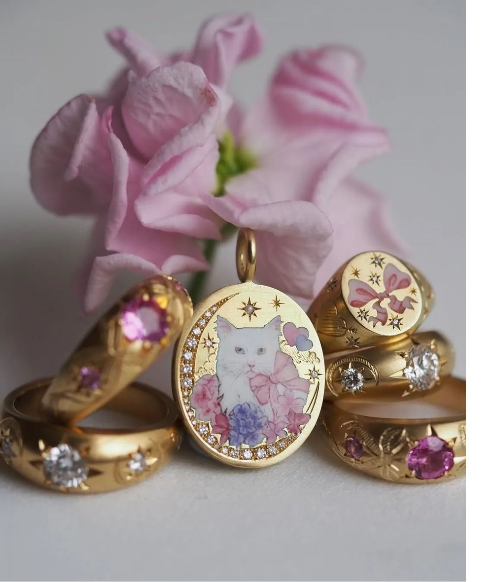 Сиси Фейн Хьюз из Cece Jewellery – искусствовед, ставшая ювелиром и создающая талантливые воздушные картины, вдохновленные татуировками. Позвольте ей превратить ваше любимое животное в сказочного персонажа, прежде чем эскиз воплотится в виде кулона с ручной гравировкой и эмалью или кольца-печатки, украшенного бриллиантами в виде звездочек.