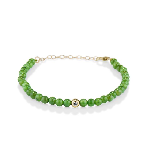 В китайской культуре жадеит используется для укрепления здоровья и удачи, он отгоняет зло и невезение. В честь китайского Нового года Эшли Чжан создала браслет из 14-каратного золота и жадеитовых бусин с бриллиантом весом 0,05 карата (фото предоставлено Ashley Zhang):
