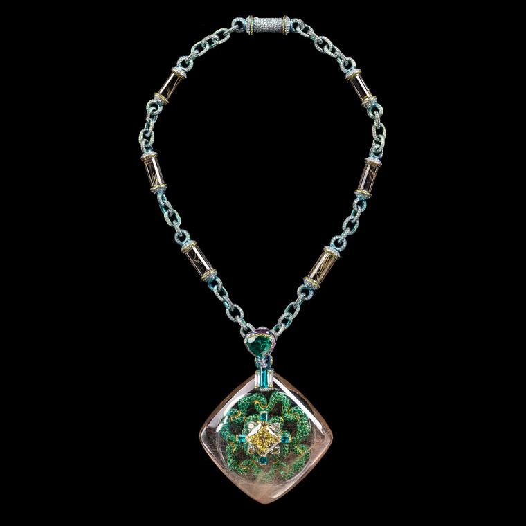 Колье Secret Abyss от Wallace Chan с желтым бриллиантом, кварцем, изумрудом, аметистом и бриллиантами. Китайский изобретатель является провозвестником титановых украшений. Его гений распознал потенциал современного материала за его легкость, твердость и способность к окрашиванию, что сильно поддерживает творческий потенциал Чана: