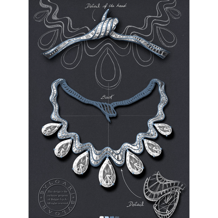 Рисунок ожерелья Serpenti Aeterna, необычного для Bulgari тем, что в нем использованы бесцветные бриллианты: