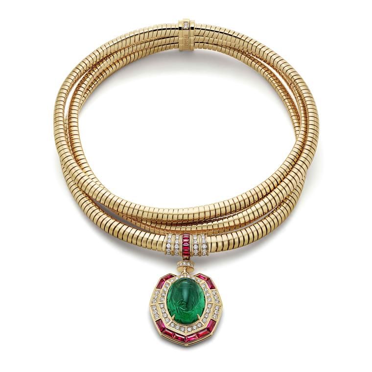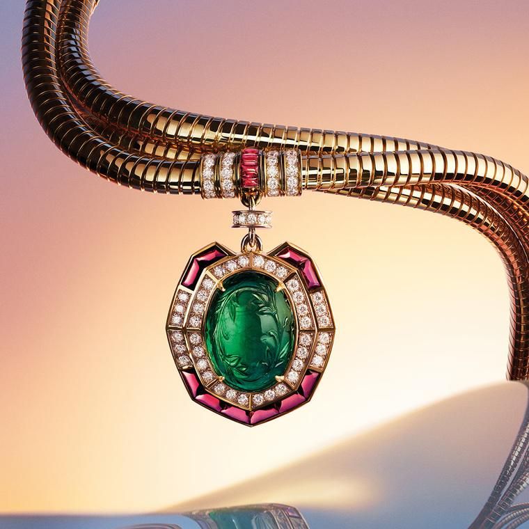 Знаковый дизайн Tubogas от Bulgari украшен выгравированным замбийским изумрудом овальной огранки весом 31,07 карата: