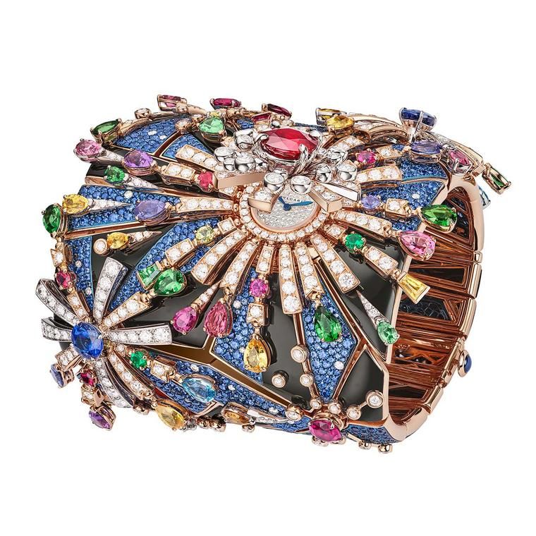 На создание Fuochi D’Artificio High-Jewellery Manchette у Bulgari ушло более 1 450 часов, в украшении использованы розовое золото, синий титан, разноцветные драгоценные камни и бриллианты, изображающие яркие фейерверки: