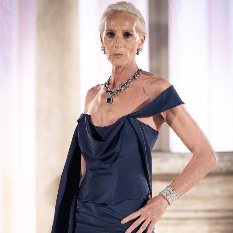 На модели – Sapphire Aeterna Waves, потрясающее платиновое колье с изысканным сочетанием бриллиантов и шри-ланкийских сапфиров, включая сапфир огранки кушон весом 38,93 карата: