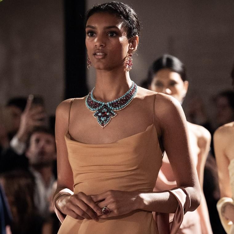 Колье Lotus Cabochon от Bvlgari представляло собой украшение из кабошонов бирюзы, изумруда, рубеллита и аметиста, закрепленных в фирменной оправе tappetino, благодаря которой камни напоминают гальку.