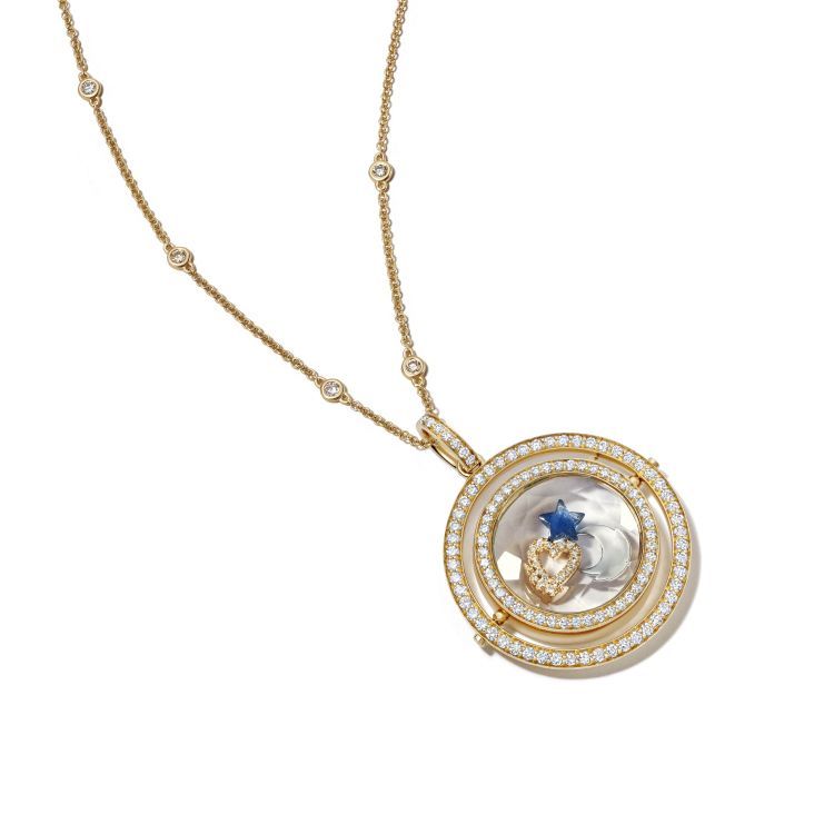 Медальон Saturn Revolving из 18-каратного золота с луной, сердцем и сине-сапфировыми звездами от Loquet (Loquet):