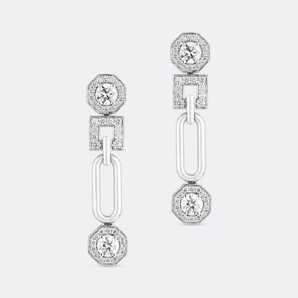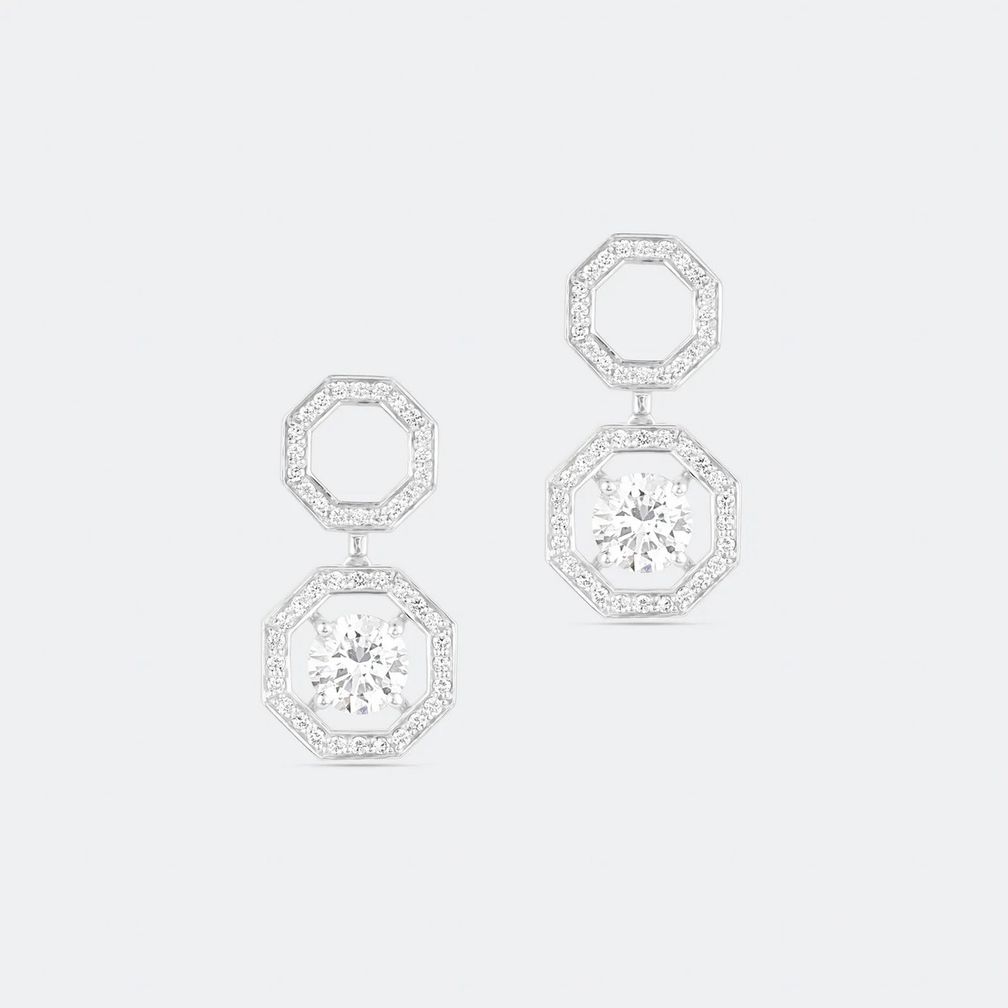 Ее любимые? Миниатюрные восьмиугольные серьги с бриллиантом в один карат, плавающим нимбом и восьмиугольной закрепкой паве. Минималистично и с максимальным эффектом. «Я девушка сережек, что я могу сказать», — добавляет она, сияя.
