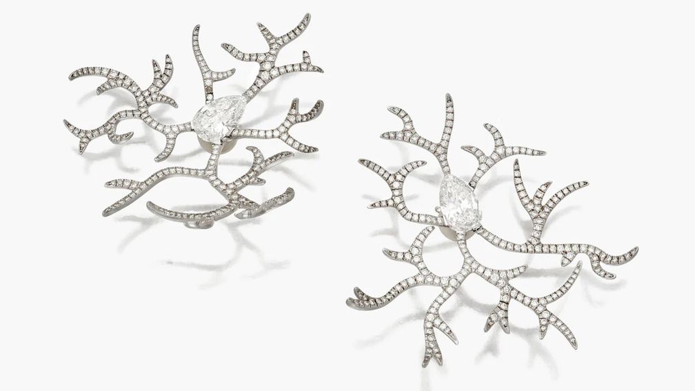 Эти серьги от JAR, дизайн которых напоминает иней, украшены бриллиантовыми веточками, исходящими от бриллиантов грушевидной формы. Их цена составила $ 508 000.