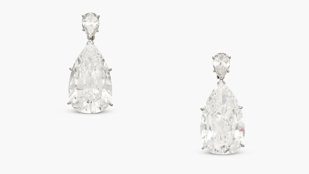 Эти серьги украшены двумя крупными бриллиантами грушевидной формы – один из них имеет вес 12,24 карата, цвет F, чистоту VVS2, а другой – 11,68 карата, цвет D, чистоту VS2. Пара сережек была продана за $ 889 000.
