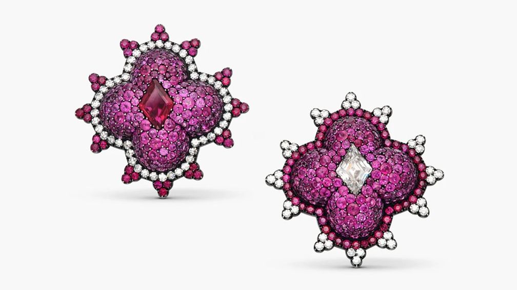 Эти серьги в форме четырехлистника от JAR были проданы за $ 698 500, что чуть выше их предварительной максимальной оценки в $ 600 000. Они украшены рубинами и бриллиантами.